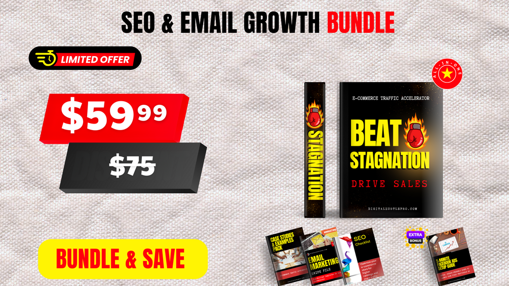 Feeling stuck with poor search visibility and ineffective marketing that fails to convert website visitors into loyal customers, hindering your online business's growth potential? The "SEO & Email Growth Bundle" offers an all-in-one toolkit designed to bridge the gap between customer acquisition (SEO) and retention (Email), finally enabling significant scaling. This bundle combines powerful SEO tactics to dramatically increase targeted traffic with a winning email strategy to convert visitors and build lasting relationships. **Included in this powerful bundle are five essential resources:** 1. **Beat Stagnation: Drive Sales (E-commerce Traffic Accelerator):** A detailed guide covering SEO basics, social media tactics, and paid advertising to drive targeted traffic, boost conversions, and scale your business. 2. **Case Studies & Examples Pack:** Learn proven strategies and gain valuable insights from real-world success stories of thriving e-commerce businesses. 3. **Email Marketing Swipe File:** Access ready-to-use, high-converting email templates for crucial e-commerce campaigns like abandoned cart recovery and customer engagement. 4. **SEO Checklist:** A step-by-step checklist and optimization roadmap to improve your website's search engine rankings and attract more organic traffic. 5. **5-Minute Ads Setup: Facebook Ads Setup Guide:** A quick-start guide to easily set up and launch effective Facebook advertising campaigns to drive immediate traffic and capture leads. This bundle leverages the powerful synergy between SEO and email marketing to achieve higher rankings and more conversions. It's ideal for entrepreneurs, small business owners, and digital marketers looking to elevate their online presence and drive sustainable growth with a cohesive strategy. **Limited-time offer: \$59.99 (Original Price: \$75).** Key features include a limited-time offer, an all-in-one solution, and extra bonus resources. Upon purchase, you'll receive an instant digital download. This product is non-refundable and for personal use only. For support, visit digitalhustlepro.com. Stop struggling with disconnected efforts and unlock your business's scaling potential by powerfully linking SEO and Email!